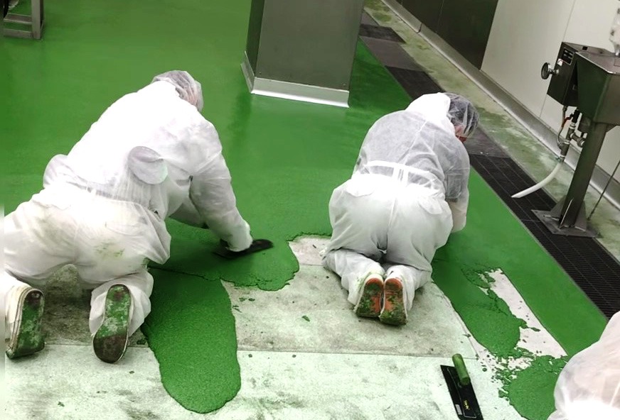 食品工場などの衛生管理された中を専用の塗床材を使って工事。